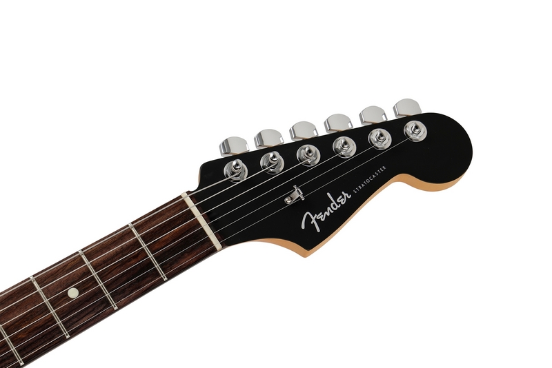 Headstock Black with White thick Fender Logo single butterfly string tree.
